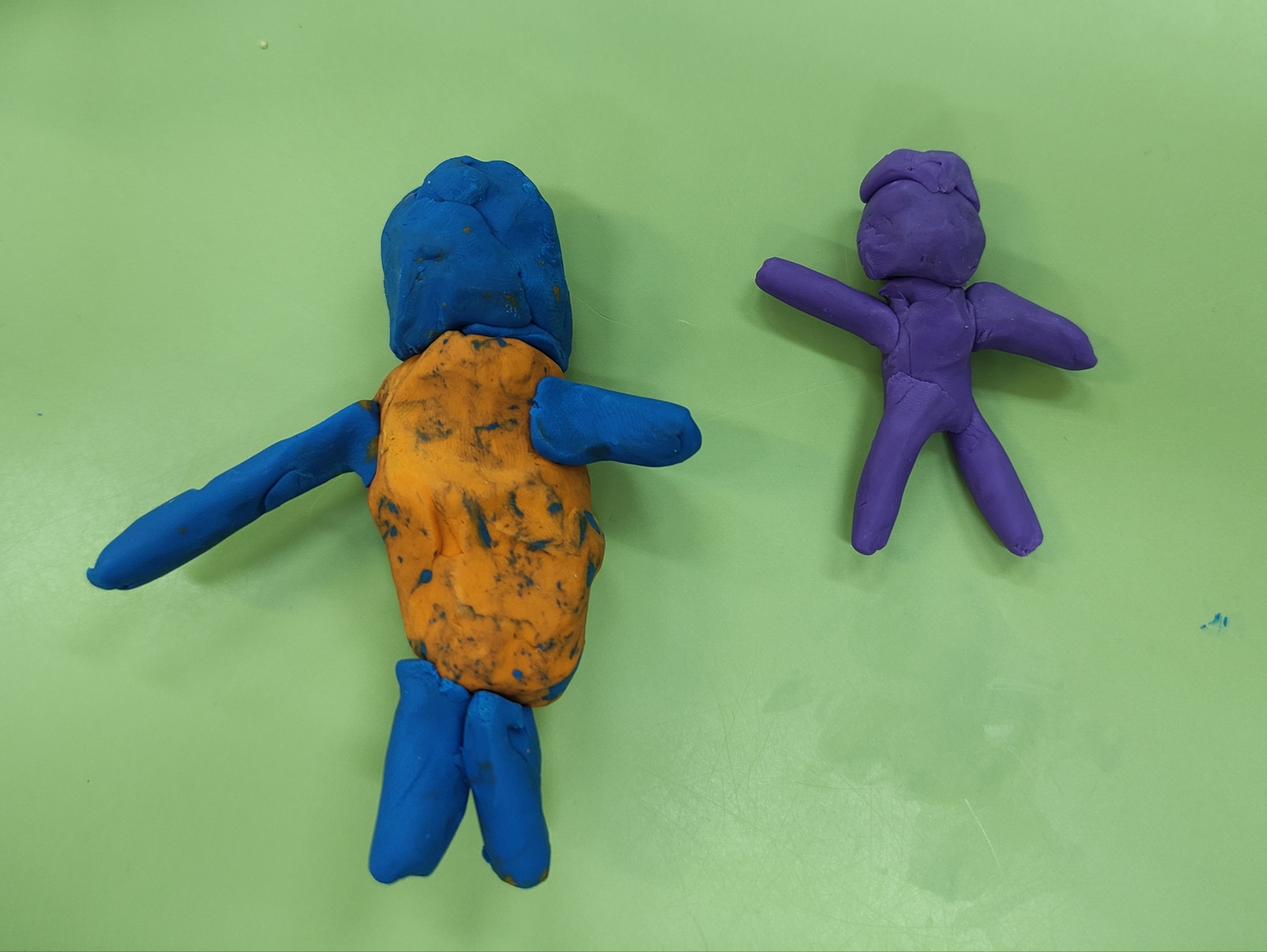 Para conocer nuestro cuerpo de un modo general, hemos nombrado e identificado muchas veces los segmentos que forman nuestro cuerpo: CABEZA, TRONCO y EXTREMIDADES (BRAZOS y PIERNAS). Hemos visto el vídeo Aprende las partes del cuerpo (pincha sobre el nombre para verlo). Y para practicar su identificación (y seguir desarrollando nuestra motricidad fina), hemos jugado a modelar cuerpos con plastilina (esto les ayuda a superar poco a poco la "etapa del renacuajo", en la que los niños/as dibujan el cuerpo humano con una gran cabeza de la que salen los brazos y las piernas):