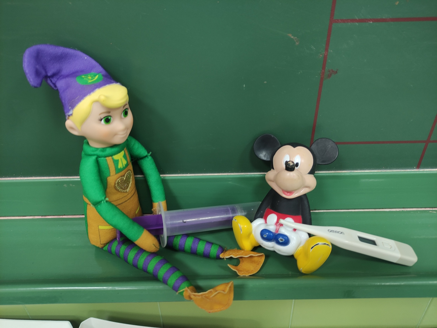 Como Pepito nos estaba cogiendo mucho cariño, un día nos dibujó un corazón:Otro día, encontramos a Pepito en la plástica... ¡se había pegado gomets por todo el cuerpo!Como algunos niños también han tenido duendes observadores en sus casas, un día recibimos la visita de uno de ellos para saludar a Pepito. ¡Le hizo mucha ilusión conocer a Roscón!Otro día encontramos a Pepito cuidando a Mickey, que debía haber pasado mala noche, y le estaba poniendo el termómetro y una inyección:Como Pepito nos ve en la asamblea jugar a colocar los números en la tabla numérica, él también quiso practicar... ¡pero se hizo un lío y le encontramos con todos los números tirados! Ese día le echaron una buena bronca por tocar las cosas de la asamblea, pero entre todos los volvimos a colocar en su sitio, y aquí no ha pasado nada... (así practicamos una vez más la orientación en la tabla):